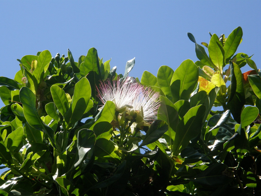Its large pinkish-white, pom pom flowers give off a sickly sweet smell to attract bats and moths which pollinate the flowers at night.